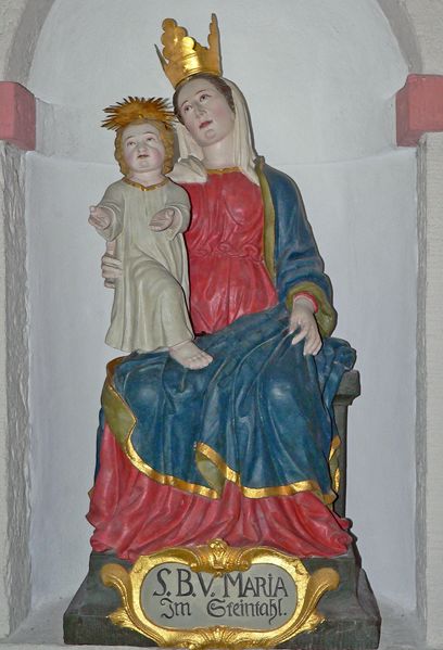 Dort schmiegt sich mitten in einer beschaulichen Waldlichtung die Wallfahrtskapelle Maria Steinthal an den einst von Weinreben bestandenen Hang, von der Spitze des Dachreiters ruft eine vergoldete Muttergottes zur stillen Einkehr. Heute finden neben kleineren Prozessionen aus der Umgebung vor allem Einzelpilger ins romantische Steinthal.