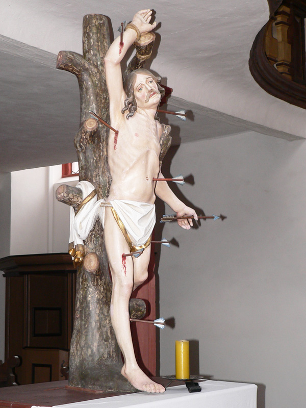 Aus älterer Zeit stammen die farbig gefassten spätgotischen Holzskulpturen des hl. Nikolaus (links) und der hl. Anna Selbdritt (rechts). Eindrucksvoll ist auch die lebensgroße Figur des hl. Sebastian unter der Orgelempore, die an den Kirchenpatron erinnert.