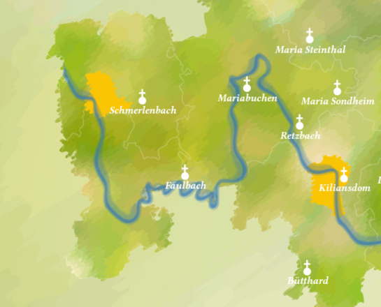 Es muss ja nicht gleich Spanien sein, denn auch im Bistum Würzburg locken Dutzende unterschiedlicher Wallfahrtsorte vom Ochsenfurter Gau bis hinauf in die Rhön vom Untermain bis zu den Haßbergen. Teils gibt es stattliche Kirchen zu bestaunen wie etwa in Würzburg, Dettelbach, Mariabuchen, Hessenthal oder Maria Limbach. Wer es beschaulicher mag, der findet abseits der großen Pilgerströme aber auch herrliche Kleinode oder schlichte Kapellen. Daneben laden Wege wie der Fränkische Marienweg oder eben der Jakobsweg zu längeren Pilgermärschen ein.