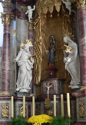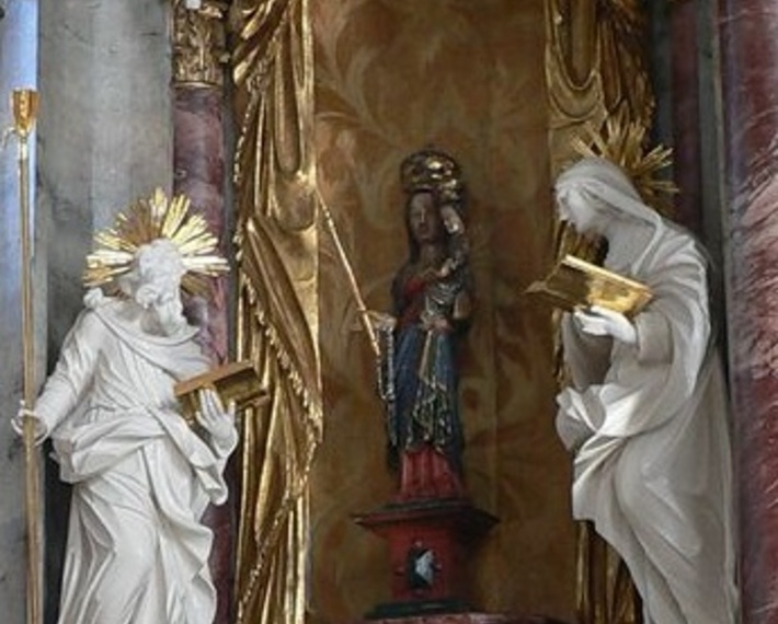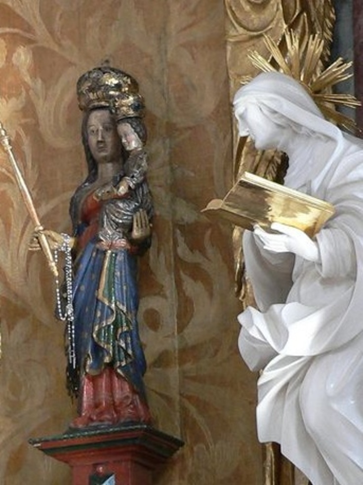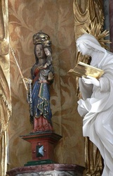 Erklärtes Ziel der Wallfahrer ist das Fridritter Gnadenbild auf der linken Seite, das in seinen ältesten Teilen bis in die Mitte des 14. Jahrhunderts zurückgeht. Die 1,20 Meter große Marienfigur, die noch bis nach 1945 mit kostbaren Gewändern bekleidet wurde, wirkt majestätisch-streng; auf ihrem linken Arm thront Jesus mit einem aufgeschlagenen Buch, in der Rechten trägt sie das Zepter. Experten sehen in der Jesuskind-Figur eine jugendliche Maria, die einer Anna-Selbdritt-Gruppe entnommen wurde und vermutlich in der Barockzeit dem Gnadenbild auf den Arm gesetzt wurde. In die Brust der Figur sind hinter einem Bergkristall Reliquien der Heiligen Margarethe eingelassen; in früherer Zeit befestigte man hier ein Zettelchen, das als Berührungsreliquie gegen Epilepsie dienen sollte.