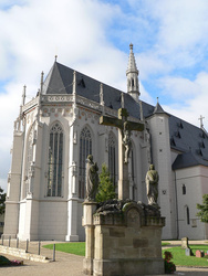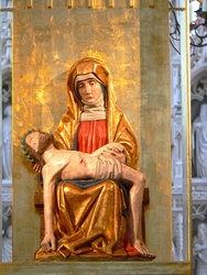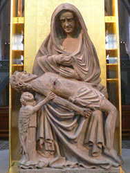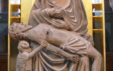 Hinter dem neuen Volksaltar erhebt sich eine in warmem Gold gehaltene Stele, die nun beide Haßfurter Gnadenbilder birgt: Mit Blick zu Volk und Langhaus steht die farbig gefasste Holz-Pietà aus der Zeit um 1480. Auf der Rückseite steht das ursprüngliche Gnadenbild, eine außergewöhnliche Sandstein-Pietà aus der Zeit zwischen 1390 und 1410. Diese Figur stand während der Blütezeit der Wallfahrt im 16. Jahrhundert im Zentrum des Kirchenschiffs, später rückte sie zugunsten der Holzpietà in den Hintergrund und war außen am Portal angebracht. Das Besondere an dieser Pietà ist, dass Maria ihren Sohn nicht selbst hält, sondern einen Trostengel zur Seite hat, der den Leichnam stützt und gemeinsam mit ihr den Tod Christi beweint. Die Aussage dieser Darstellung ist eindeutig: Auch in der tiefsten Not sind wir nicht alleine, sondern Gott stellt uns immer wieder einen Trostengel zur Seite, der uns spürbare Hilfe in unserem Leid ist.