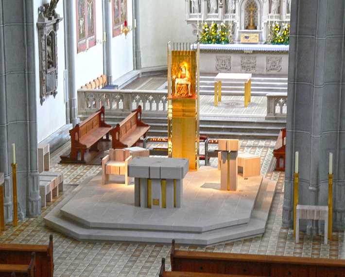Die neu entstandene Altarinsel unter dem Chorbogen wird überragt von einem fast siebzehn Meter hohen Chorraum, in dem der Tabernakel als leuchtender Rettungsanker und Symbol der Eucharistie hervorstrahlt. Volksaltar, Leuchter, Sedilien, Vortragekreuz und Ambo wurden von Dr. Jürgen Lenssen entworfen; in den Altar sind Reliquien von Schwester Resituta, Liborius Wagner und vom ersten Würzburger Bischof Burkard eingelassen.