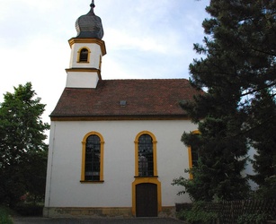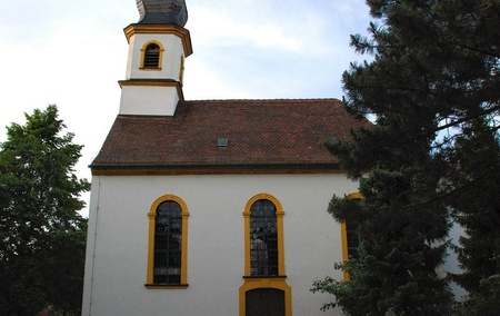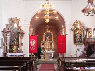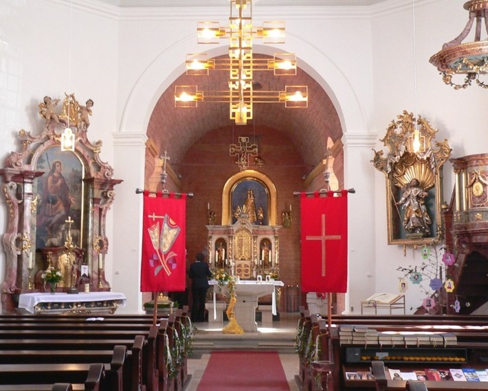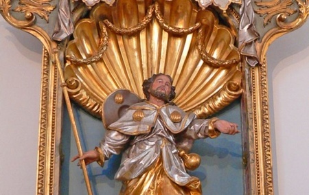 Auf der rechten Seite des Gemeinderaums befindet sich die Figur des Kirchenpatrons Jakobus, umstrahlt von einer Goldmuschel im Hintergrund.