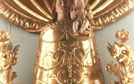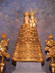 Das Gnadenbild befindet sich weiterhin im Zentrum des Kirchenraums, nämlich an der rückwärtigen Wand der Casa Santa; die holzgeschnitzte und vergoldete Madonna (1680) ist eine Devotional-Kopie der Madonna von Loreto und repräsentiert einen unverwechselbaren Typus, der nur zwei Mal in ganz Unterfranken zu finden ist: Maria ist in einen steifen, geschlossenen, goldenen Mantel gehüllt; während eine Hand völlig verdeckt ist, ist die andere, auf der das göttliche Kind sitzt, kaum sichtbar. Die Aussage dieser beinahe abweisend wirkenden Darstellung ist eindeutig: Einzige Wirkmöglichkeit der in den Mantel gebannten Maria ist die Fürbitte bei ihrem Sohn, den sie dem Betrachter präsentiert; ihm überlässt sie den ganzen Handlungsspielraum.