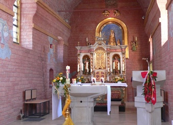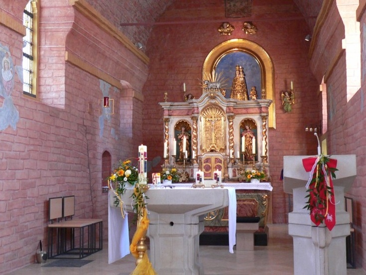 Der Raum der Casa ist seit dem Umbau völlig neu strukturiert: Vorne, zum Gemeinderaum hin, stehen Ambo und Volksaltar als zentrale Elemente der Liturgiefeier. Direkt dahinter befindet sich der Hochaltar mit Tabernakel und Gotteslamm. Die goldene Loretomadonna schwebt dabei wie eine wertvolle Verheißung über dem Ganzen. Ihr Blick wiederum führt zurück in den Gemeinderaum und auf das Kreuz über dem Altar, das auf Christus als Zentrum des Glaubens verweist.