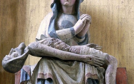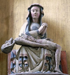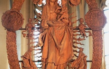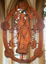 1332 siedelten sich Beginen auf dem Kirchberg an.Um 1370 entstand das Volkacher Gnadenbild. Nach Aufhebung der Beginenklause im Jahre 1422 übernahm eine Marienbruderschaft, der auch der Würzburger Bischof Gottfried Schenk von Limpurg (1444-55) angehörte, die Pflege der Wallfahrt. Die große Spenden- und Opferbereitschaft unter Adligen und Bürgern ermöglichte bald einen Kirchenneubau, der im Wesentlichen unter Bischof Rudolf von Scherenberg (1466-95) ausgeführt wurde. Ein letzter Rest der abgetragenen Vorgängerkirche befindet sich im nicht ausgebauten Turm zwischen Chor und Langhaus: Der heute als Sakristei genutzte Raum bildete einst den Altarraum der Chorturmkirche.