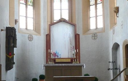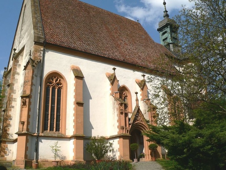 Zunächst entstand der Chor, der 1451 geweiht wurde. 1457 folgte das Langhaus, das reichhaltig mit Kunstwerken ausgestattet wurde: Dazu gehören unter anderem ein Wandfresko des hl. Christophorus, farbenprächtige Chorfenster, ein spätgotisches Kruzifix und eine Holzplastik der Anna Selbdritt aus der Riemenschneider-Schule. Kurz vor Vollendung der Kirche gab man 1521 bei Tilman Riemenschneider die „Madonna im Rosenkranz" in Auftrag. 1524 fertiggestellt, bildet sie eine der letzten Arbeiten Riemenschneiders.