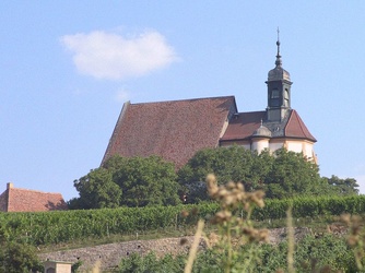Bis weit in das Mittelalter reicht die Geschichte von „Maria im Weingarten" zurück. Bereits im 10. und 11. Jahrhundert befand sich an der Stelle des heutigen Gotteshauses eine dem Apostel Bartholomäus geweihte Kirche. Sie war zugleich die Urpfarrkirche Volkachs und der Siedlungen an der Mainschleife. Von den einst dort stehenden Häusern der Vikare und Kirchner sind nur die Gebäude beidseits des Tores erhalten. Als sich Volkach im 13. Jahrhundert zur Stadt entwickelte, verlegte man die Gottesdienste in die Tochterkirche im Tal, die bald auch das Bartholomäus-Patrozinium übernahm.