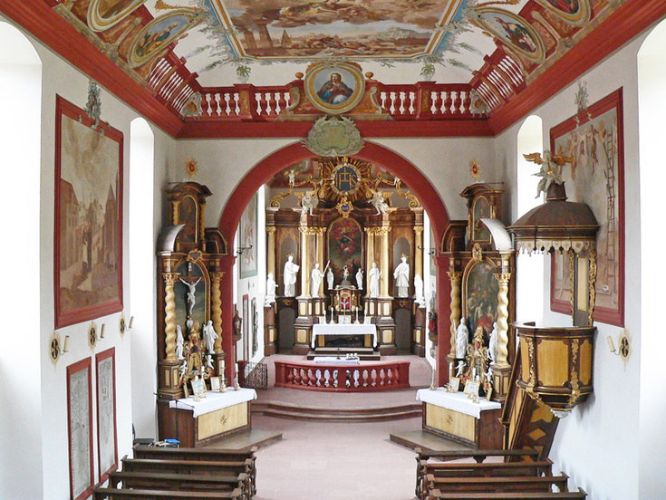 Aus älterer Zeit stammen die farbig gefassten spätgotischen Holzskulpturen des hl. Nikolaus (links) und der hl. Anna Selbdritt (rechts). Eindrucksvoll ist auch die lebensgroße Figur des hl. Sebastian unter der Orgelempore, die an den Kirchenpatron erinnert.
