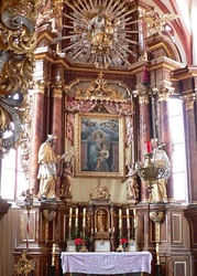 1735 wurde das Holztafelgemälde aus der Zeit um 1600 dann in einen pompösen viersäuligen Hochaltar des Kitzinger Kunstschreiners Matthias Deichelmann integriert. Vier Engel tragen das Bildnis, darüber schwebt schützend ein kleiner Baldachin. Am linken Bildrand ist der Stifter des Bildes zu erkennen, auf der linken Seite sein Wappen – ein steigendes Einhorn auf rotem Grund. Außerdem verweist eine lateinische Inschrift auf das römische Original Salus Populi Romani und damit auf eine jahrhundertealte Tradition: Der Legende nach habe Maria durch einen Schneefall in der Nacht auf den 5. August den Platz für die römische Kirche Santa Maria Maggiore angezeigt, die unter Papst Liberius im vierten Jahrhundert auf dem Esquilin erbaut und 432 unter Papst Sixtus III als eine der ersten Marienkirchen geweiht wurde.