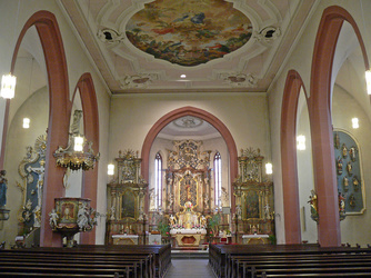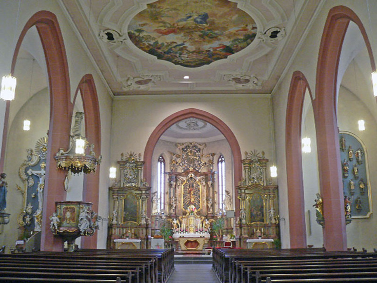 Bewusst marianisch gehalten ist auch das Deckengemälde im Langhaus, wo der Besucher einen illusorischen Blick in den Himmel erhaschen kann: Eulogius Böhler inszenierte hier 1908 in barocker Manier die Himmelfahrt und Krönung Mariens. In Anlehnung an die spätbarocke Ausstattung wählte Böhler bewusst die im Barock sehr beliebte Form des Hypäthralbildes (griech. „unter freiem Himmel"). „Vom richtigen Standpunkt aus gesehen, erscheint es dem Betrachter, als würde er durch die Decke hindurch in den freien Himmel auf das Geschehen blicken. Über der Schar der Apostel, die um den leeren Sarg Mariens gruppiert sind und verblüfft hinein oder erstaunt in die Höhe schauen, entschwebt die Himmelskönigin in den Himmel. Auf Wolken kniend, wird sie von einer Schar von Engeln und Putten geleitet und in triumphaler Auffahrt nach oben getragen. Zwei Putten schweben über ihr, um ihr die Krone aufs Haupt zu setzen. Die Aufwärtsbewegung kulminiert in der Heilig-Geist-Taube, deren Lichtglanz von der göttlichen Herrlichkeit kündet, in die Maria aufgenommen wird." (Michael Koller, Kirchenführer)