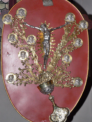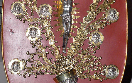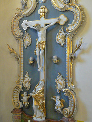 In ein dunkles Kapitel in der fränkischen Geschichte verweist schließlich die Kreuzkapelle im Außenbereich der Höchberger Kirche, die im Zuge des Langhausneubaus an den jetzigen Standort verlegt wurde. Die Kapelle mit dem mächtigen Kreuz samt Assistenzfiguren bildet den Abschluss eines Wegs aus sieben Kreuzwegstationen, auch „Sieben Fälle" genannt. Sie ziehen sich vom Würzburger Hofbräuhaus bis in die Dorfmitte von Höchberg und wurden 1626/1627 als Sühne für die Hexenverbrennungen errichtet, deren es allein während der achtjährigen Regentschaft von Fürstbischof Ehrenberg 219 gab. Noch heute erinnert der Höchberger Ortsteil Hexenbruch an den Ort, wo die Scheiterhaufen brannten. Als Zeichen ihrer eigenen Rechtgläubigkeit soll deshalb die Bruderschaft des fürstbischöflichen Hofgesindes den Bau der Bildstöcke veranlasst haben. Neben Würzburger Bürgern steuerte übrigens auch das Domkapitel hundert Gulden bei, die Kreuzigungsgruppe wurde vom Fürstbischof höchstselbst gesponsert. An den Figuren sollen Balthasar Grohe, (Schüler Michael Kerns) Michael Kern selbst sowie der Windsheimer Meister Georg Brenck gearbeitet haben.