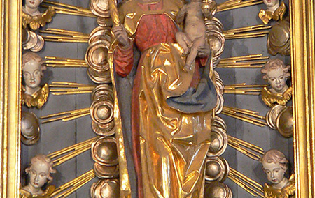 Im linken angedeuteten Seitenschiff steht ein Kreuzaltar im Stil des Rokoko (1773) mit dem Kreuz im Zentrum und der Mater dolorosa am Kreuzesfuß. Der Hauptaltar im Chorraum birgt das über zwei Meter hohe Gnadenbild aus der Zeit um 1470. Bis 1738 stand die Madonna am rechten Seitenaltar, während das Gemälde „Himmelfahrt Mariens" von Oswald Onghers (1658) im Hochaltar hing (jetzt an der nördlichen Chorwand).