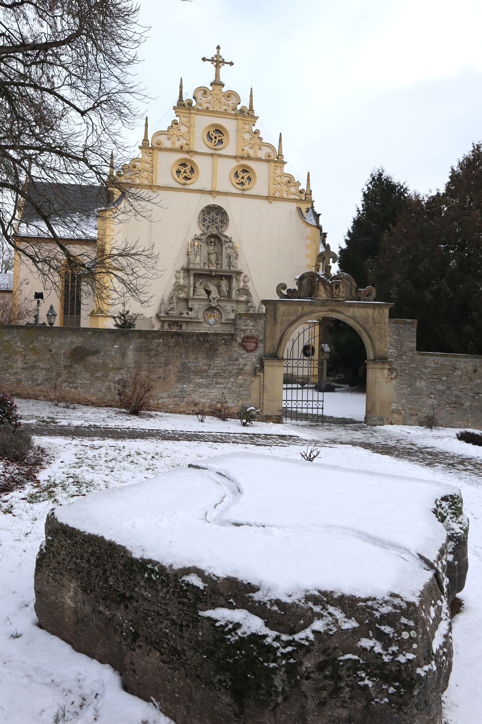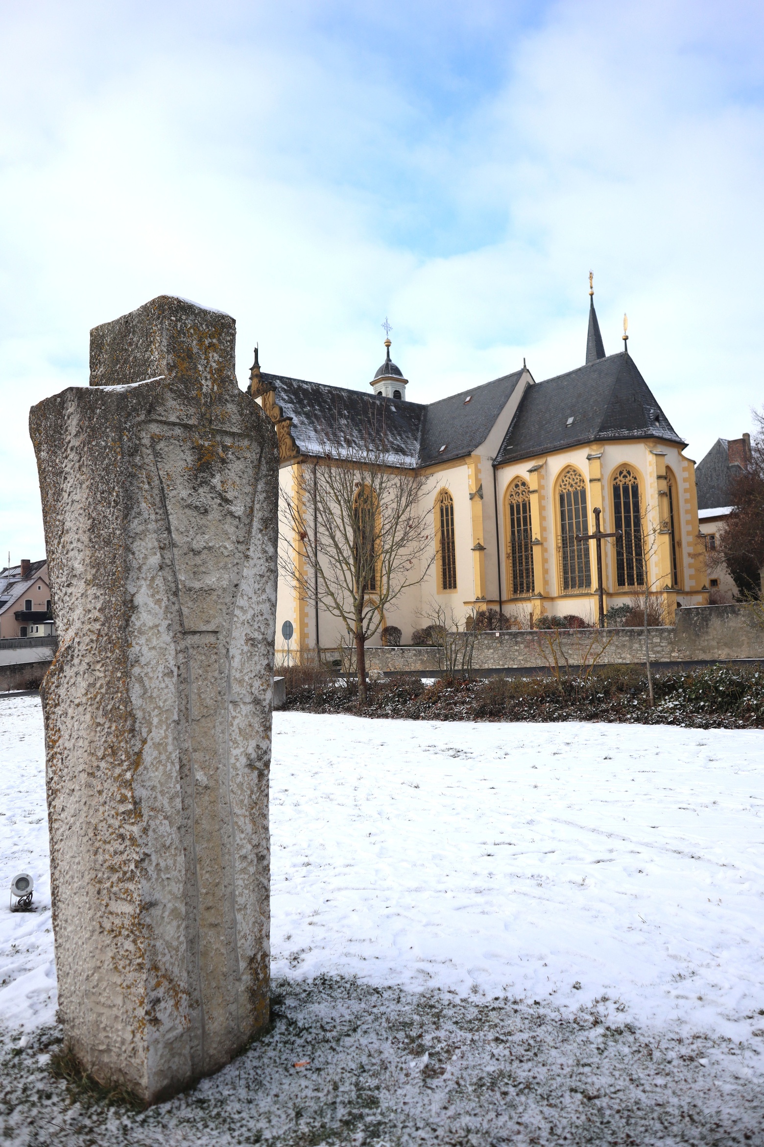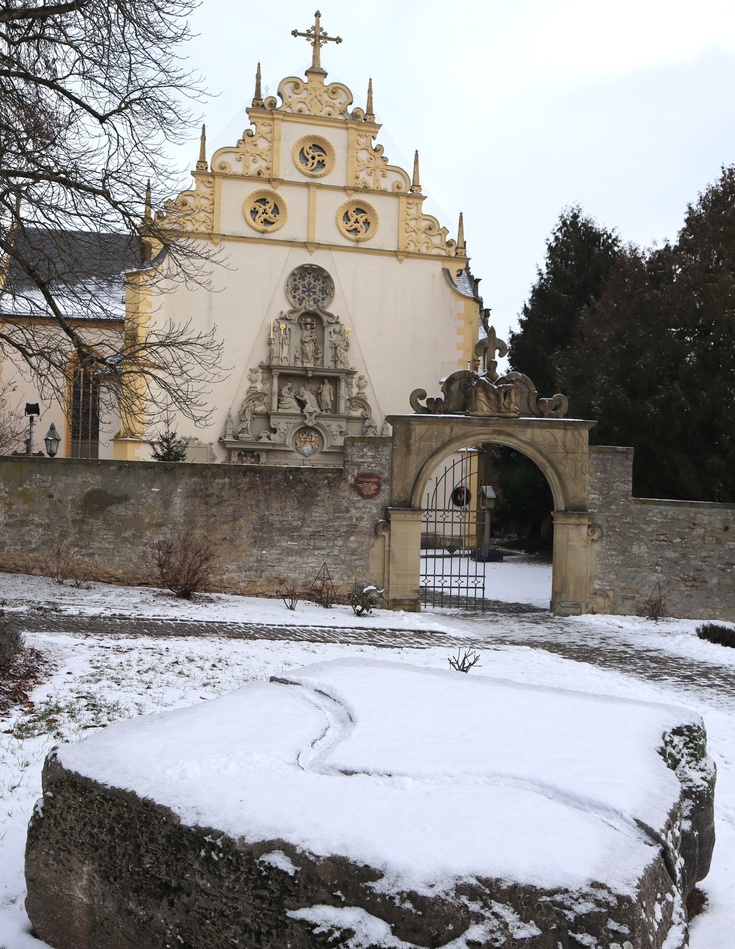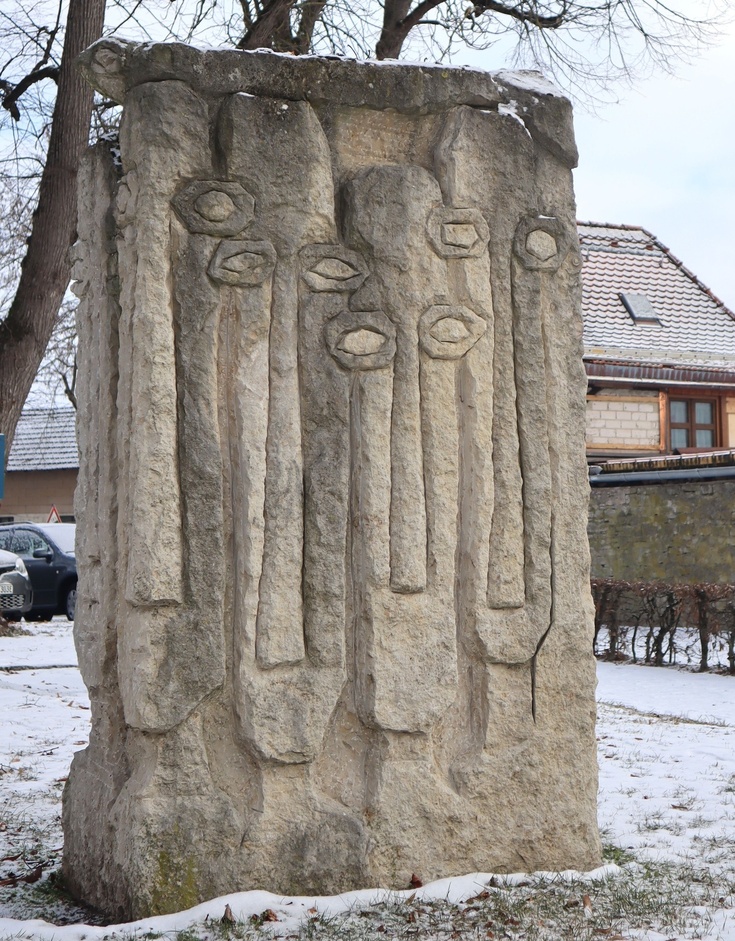 Sieben Künstlerinnen und Künstler hatten sich im Jahr 2005 mit dem Pilgerthema auseinandergesetzt. Vier Wochen lang arbeiteten sie sich in ihren Stein hinein und durch ihren Stein hindurch – unter den Augen der interessierten Öffentlichkeit an der Dettelbacher Mainlände. Auf diese Weise entstanden Skulpturen über einen „fundamentalen Aspekt der menschlichen Existenz“, wie es im Begleitheft zum Projekt heißt. „Leben ist immer Pilgerschaft, wie immer die selbst gesteckten oder vorgegebenen inneren oder äußerlichen Ziele auch heißen mögen.“ Der wuchtige Block „In Transito“, gefertigt von der italienischen Künstlerin Emanuela Camacci, eröffnet den Skulpturenweg. Ein Übergang ist dargestellt: Die Bewegung während des Pilgerns ins Innere hinein. Innen ein großer Kreis, dazwischen Platz für Luft und Leere – und Platz für den Durchblick auf den Grünstreifen entlang der Stadtmauer.